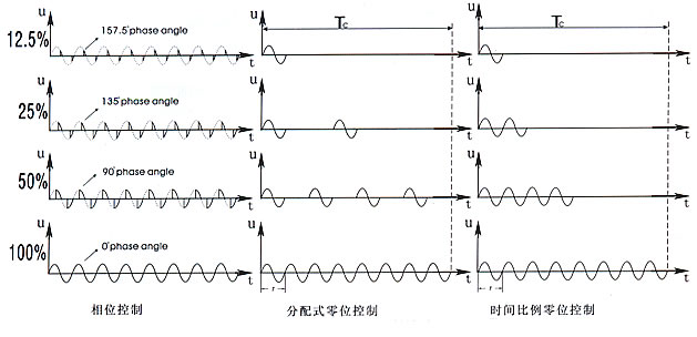 綜觀國內(nèi)外可控硅電力控制器產(chǎn)品,控制模式無非就是兩種:相位控制和零位控制(分配式零位控制、時(shí)間比例零控制)。三者之間的比較請看以下圖表。